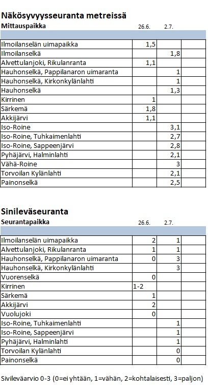 Kesätiimimme kiertää lomakauden aikana säännöllisesti Hauhon rannoilla takistamassa sinilevätilanteen. Samalla mitataan näkösyvyys, mikäli se on kohteessa mahdollista. Tiimit käyvät myös veneretkillä vesillämme ja mittaavat näkösyyden ja tarkistavat sinilevätilanteen järvien eri kohdista.